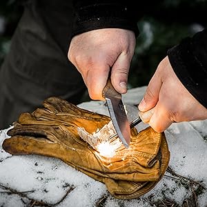 The 1066 carbon steel blade (56-57 HRC) with a full tang design ensures strength and reliability. Its Scandinavian grind allows for precise cuts, making it ideal for wood carving, batoning, and general outdoor tasks.