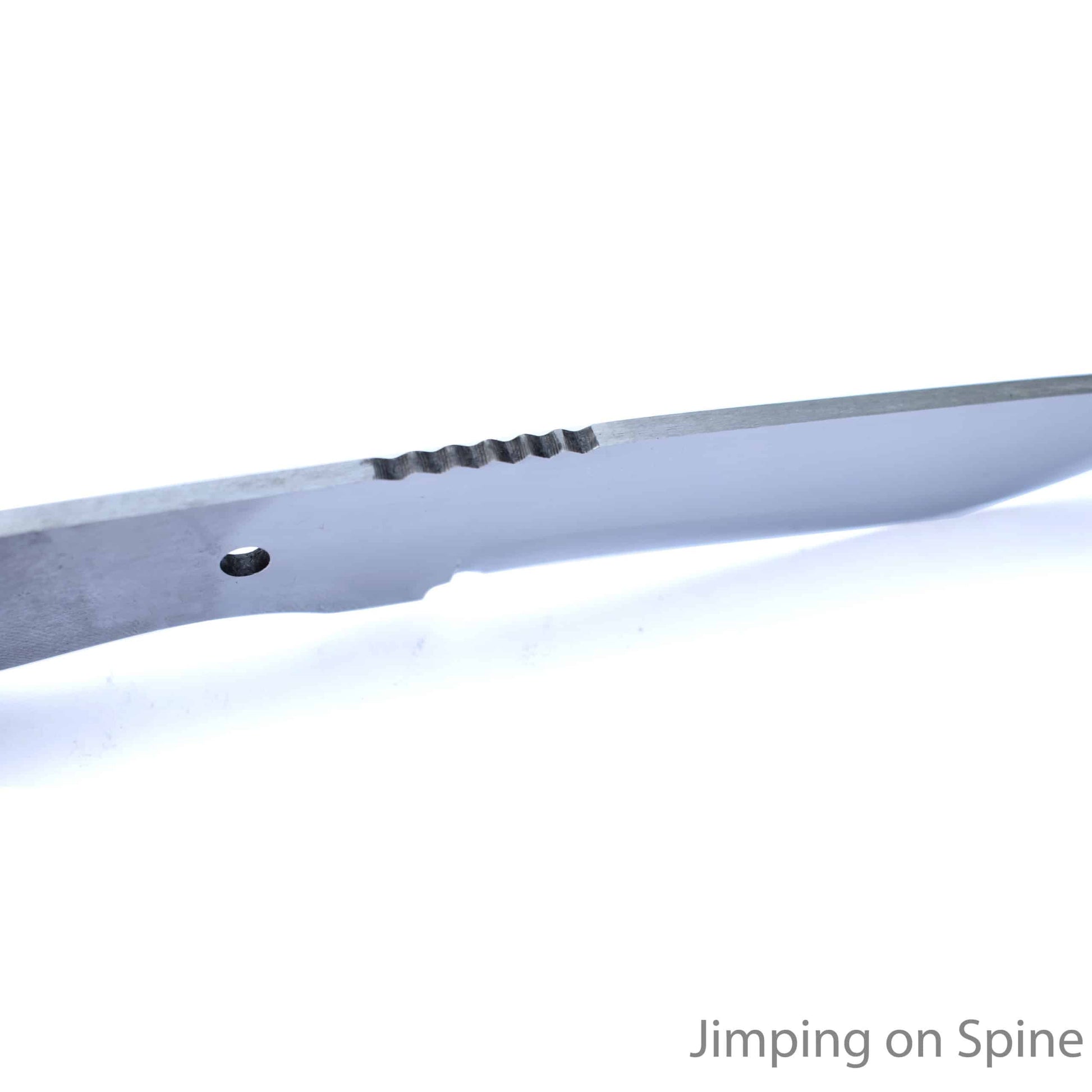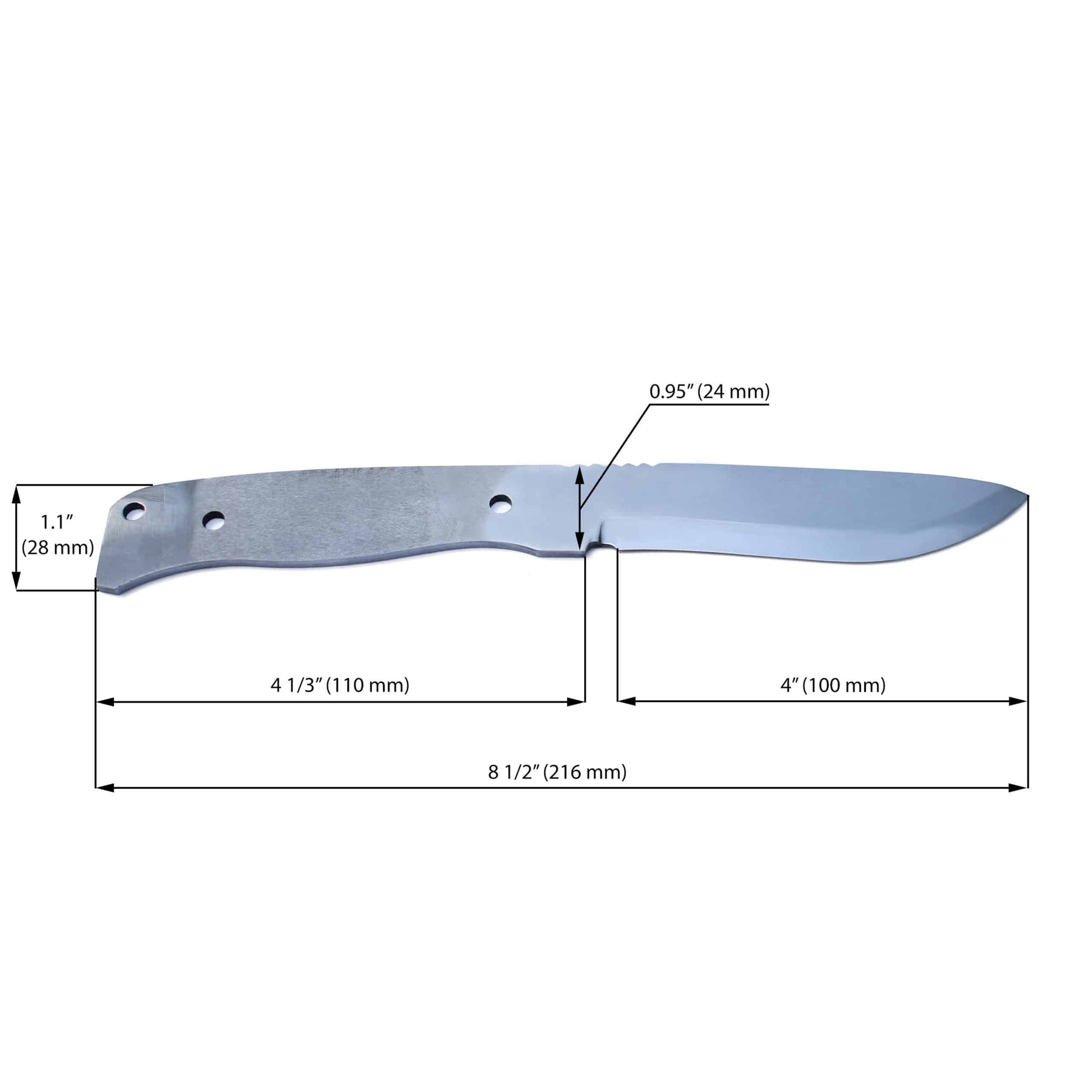 The blank has a full-tang design, which allows you to make your own knife for camping, bushcraft, or household needs. A full tang blade design refers to the steel running from the tip of the knife down to the butt of the handle, with the knife handle made up of two pieces that are securely bolted or riveted together around it. This type of design ensures that a knife is less likely to break and adds strength and stability.