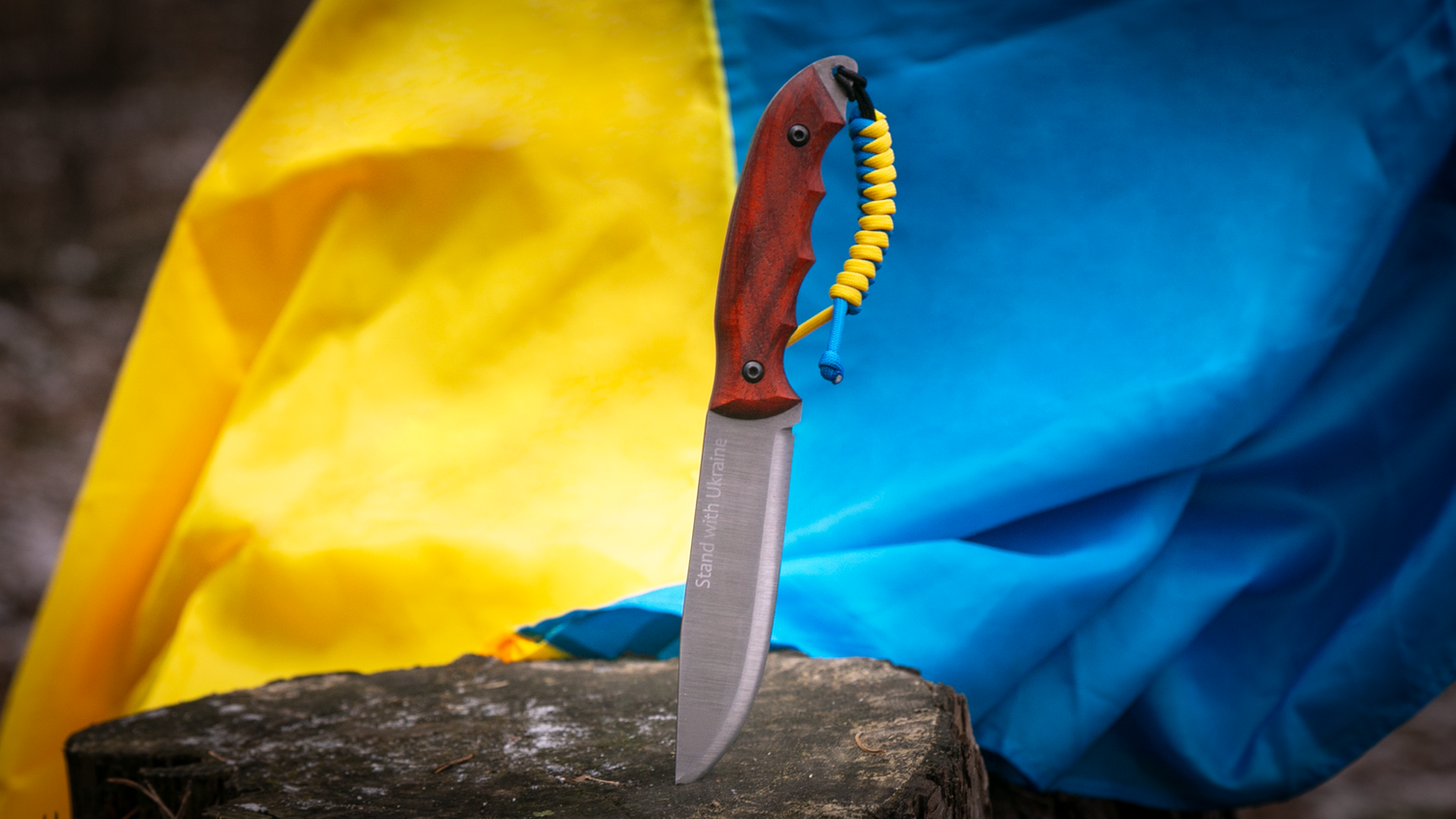 The “Stand With Ukraine” knife is a full-tang bushcraft tool forged from high-carbon 1066 steel, hardened to 56–58 HRC for dependable performance. Featuring a true Scandi grind and a padauk wood handle, it’s built for precision work in any weather. Its ergonomic shape and balanced design provide confidence for wood carving, food prep, and survival tasks. A blue-and-yellow lanyard honors Ukraine’s spirit, and 50% of every purchase supports civilians in frontline regions through the “Zerna Dobra” Foundation. This knife isn't just a tool—it's a contribution to something greater.
