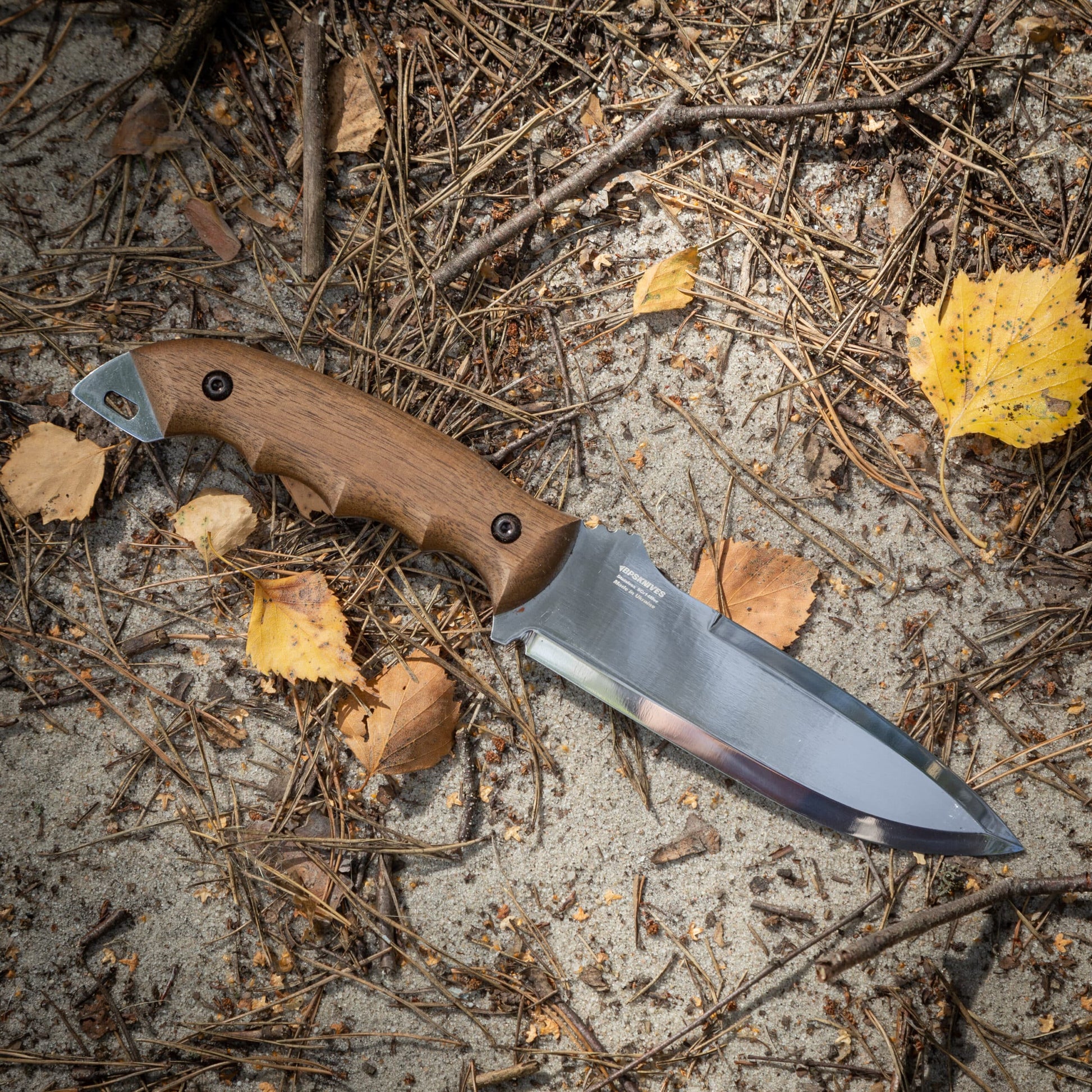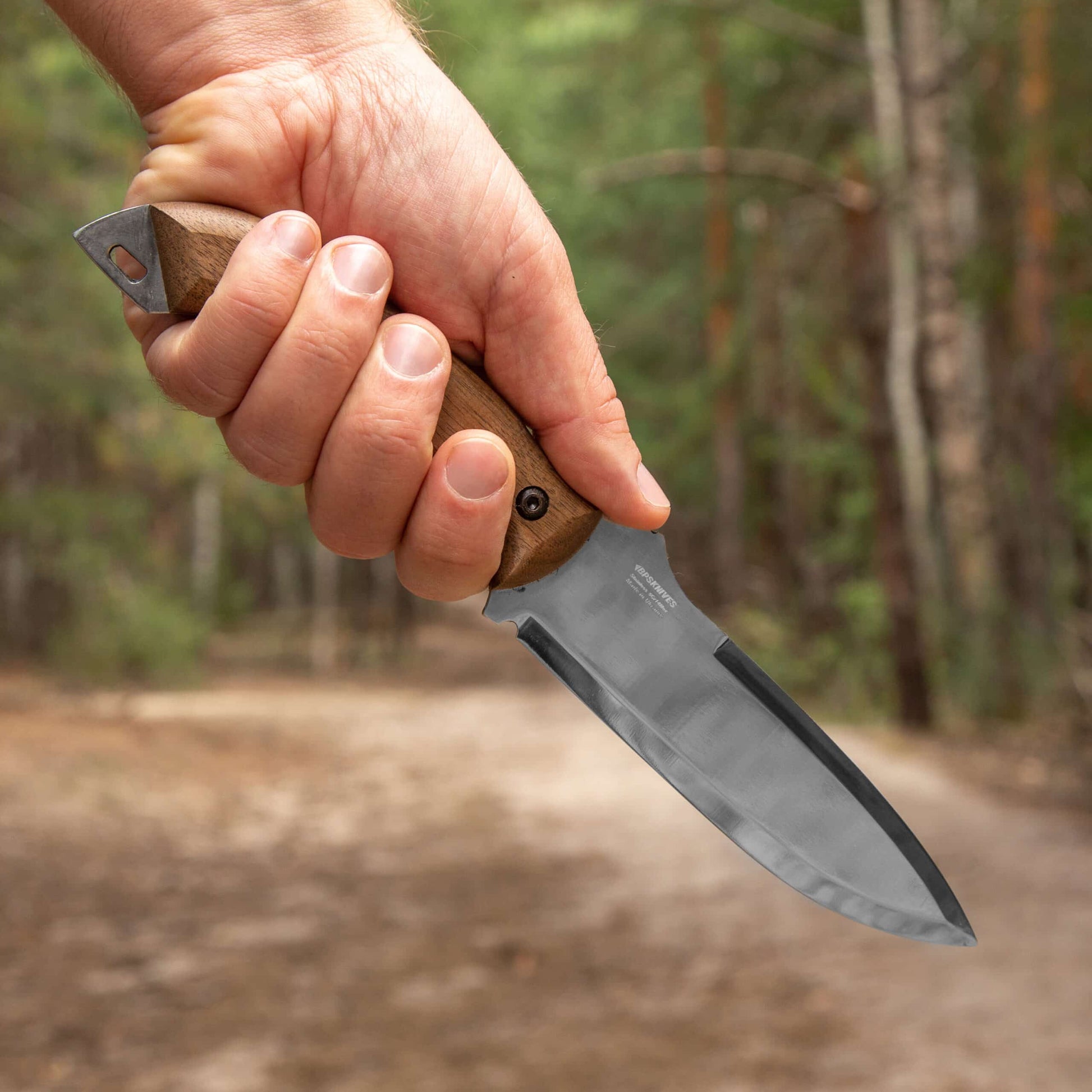 A medium-sized full tang bushcraft knife with a 1066 carbon steel blade, Scandi grind, and ergonomic walnut handle. Reliable for outdoor tasks and everyday use.