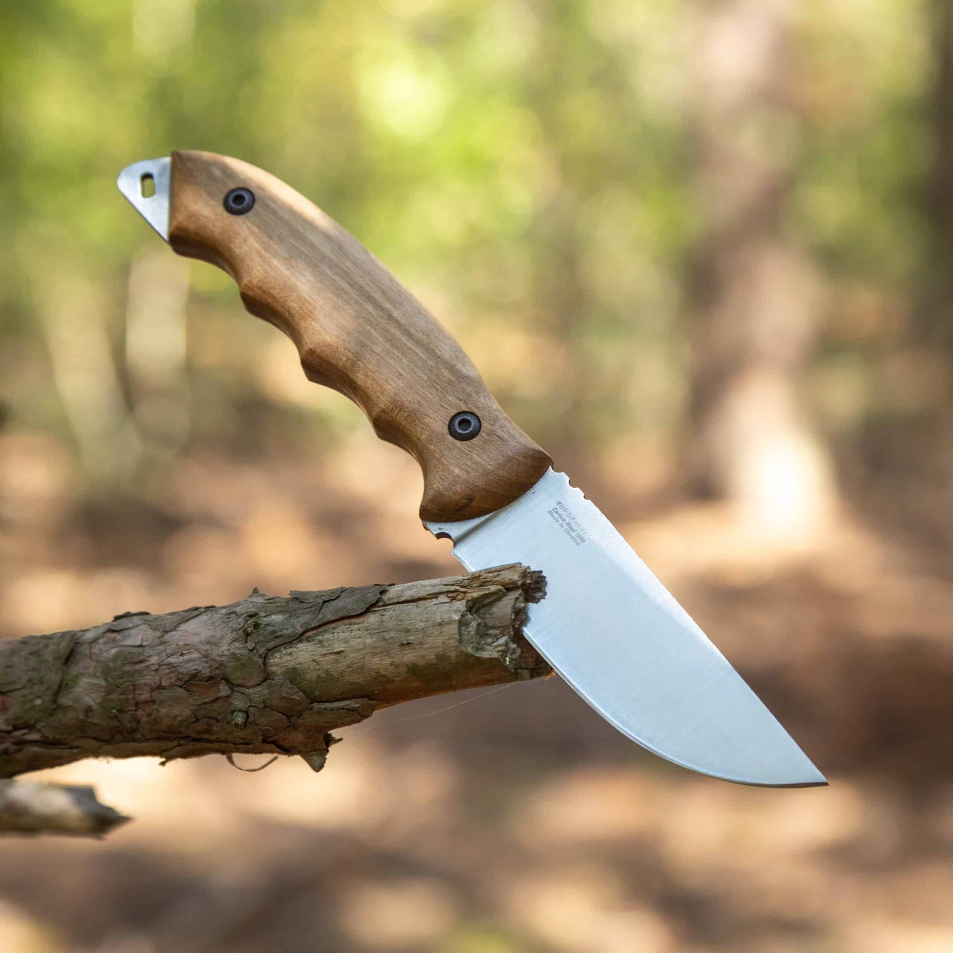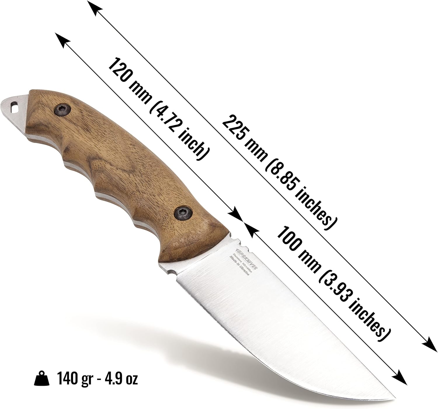 The HK4 SSH is a robust fixed-blade knife made for bushcraft, hiking, hunting, and everyday field use. Its 5Cr14MoV stainless steel blade offers sharpness and durability, hardened to 56–58 HRC to retain its edge during heavy-duty tasks. With a 100 mm blade and full-tang construction, this knife delivers reliable control and cutting power. The walnut handle, finished with Danish oil, combines resilience with grip comfort even in wet conditions. Complete with a leather sheath for safe carrying, the HK4 is a go-to tool for campers, survivalists, and adventurers alike.