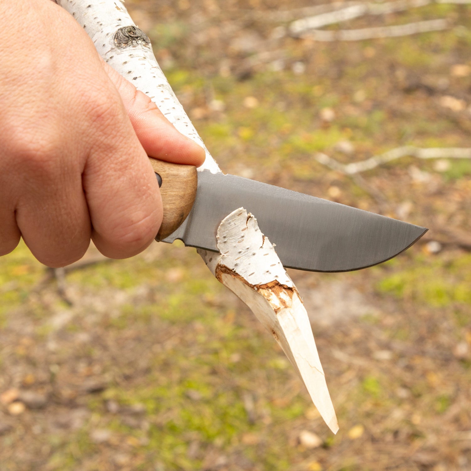 A compact fixed-blade camping knife crafted from premium D2 tool steel with a 30° micro bevel and ergonomic walnut handle. Razor-sharp, durable, and ideal for outdoor versatility.