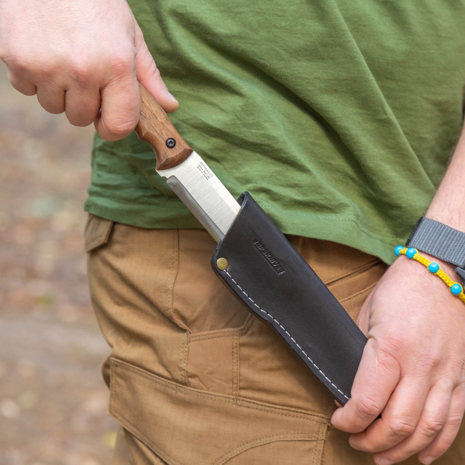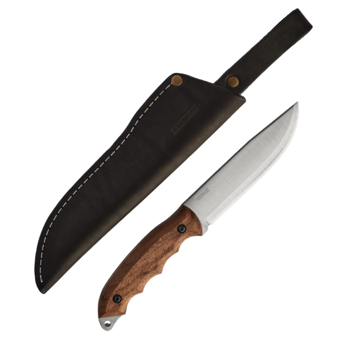 A versatile bushcraft knife with a full-tang 1066 carbon steel blade and a true Scandi grind. Its ergonomic walnut handle ensures a secure grip and exceptional durability.