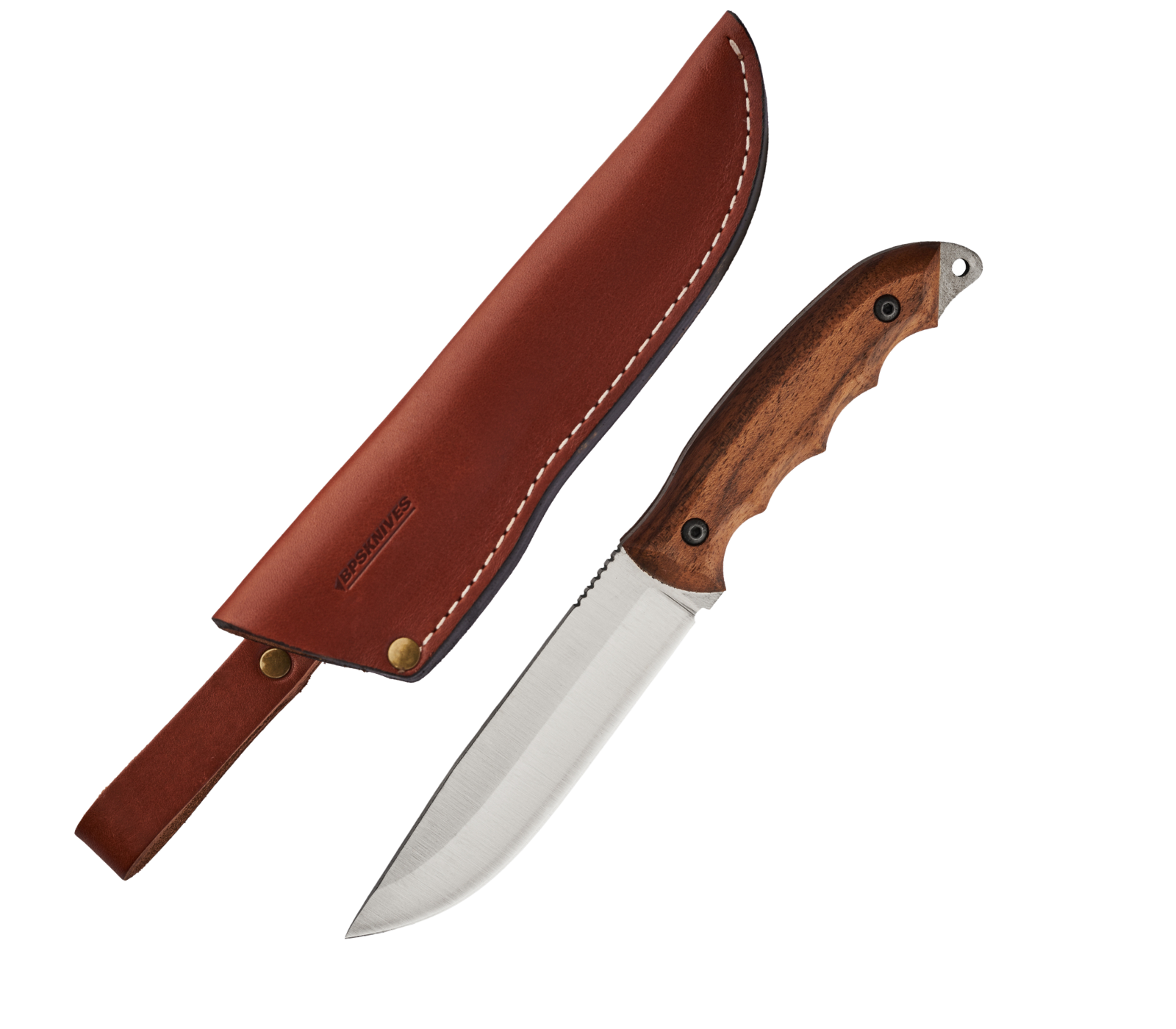 Full tang stainless steel knife with Scandi grind and ergonomic walnut handle. Sharp, balanced, and perfect for outdoor tasks from bushcraft to camping.